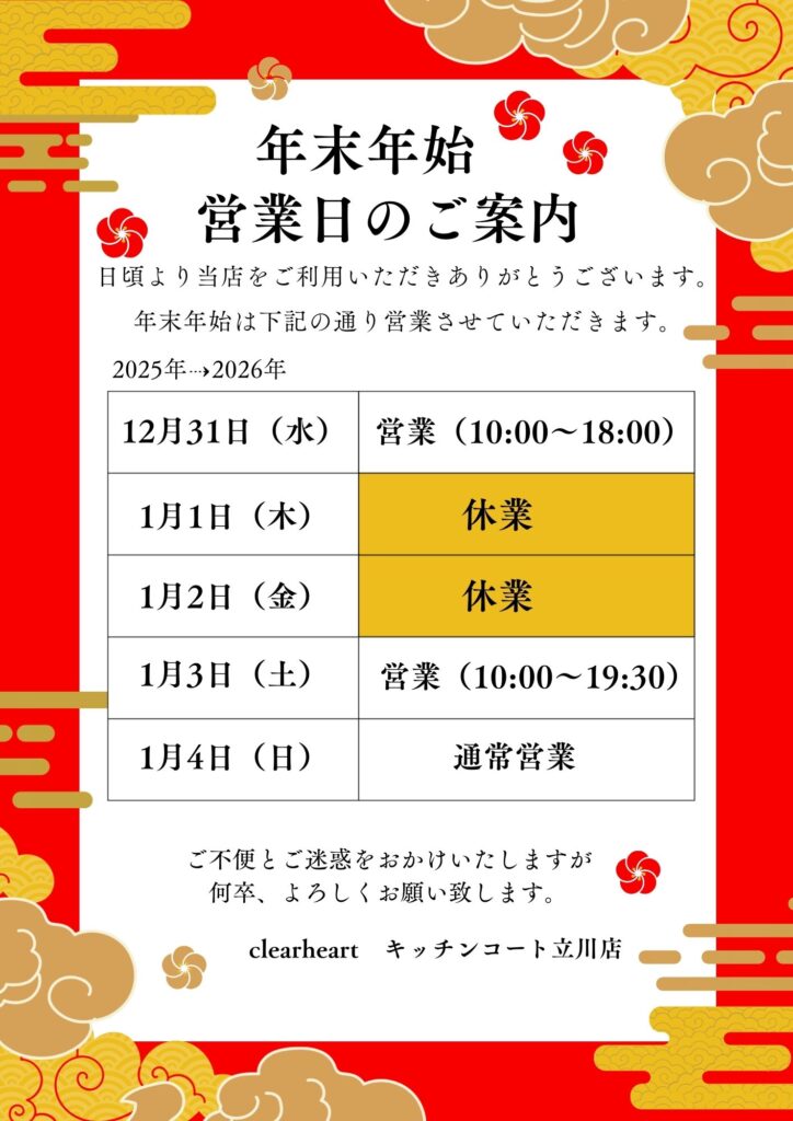 《キッチンコート立川店》年末年始の営業時間のお知らせ